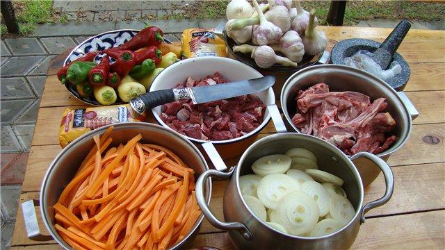 Βάζουμε το κρέας μαζί με τα χόρτα χοντροκομμένα, το πιπέρι, τα γαρίφαλα και τη δάφνη, και αφήνουμε να κοκκινίσουν τόσο το κρέας όσο και τα χόρτα.